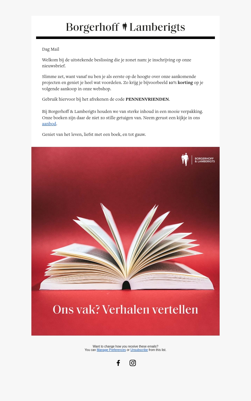 Welkom bij je nieuwe Borgerhoff & Lamberigts nieuwsbrief. Ontvang als eerste updates over onze aankomende projecten en profiteer van exclusieve kortingen. Gebruik de kortingscode PENNENVRIENDEN en geniet van 10% korting in onze webshop.