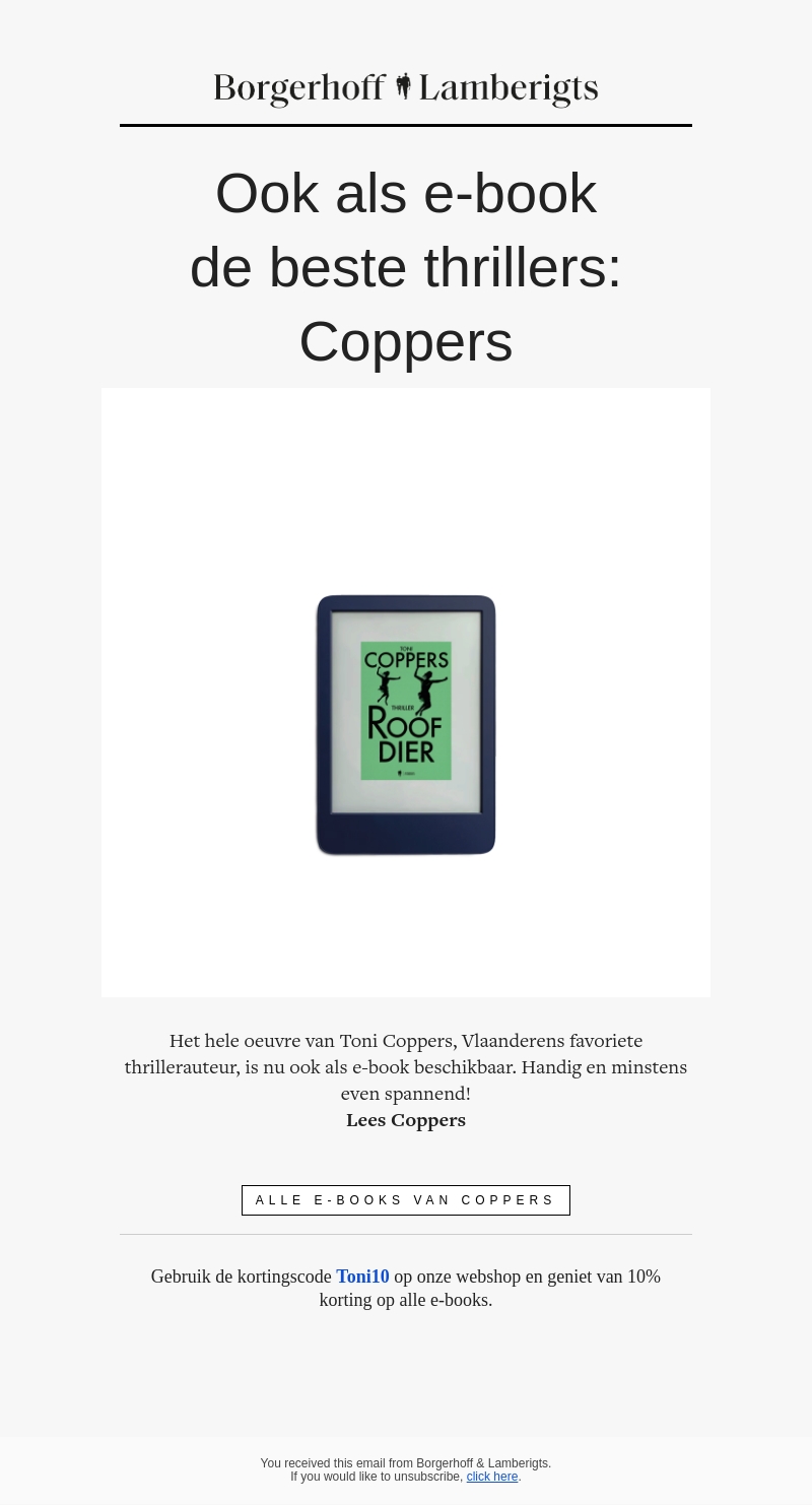Het hele oeuvre van Toni Coppers, de favoriete thrillerauteur van Vlaanderen, is nu beschikbaar als e-book. Maak gebruik van de kortingscode en geniet van een spannende leeservaring. Ideaal voor thrillerliefhebbers die graag digitaal lezen.