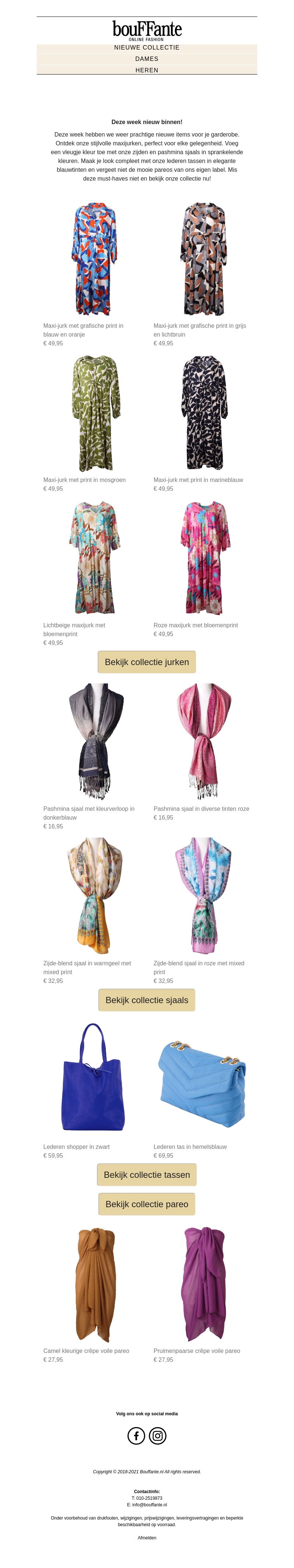 Deze week hebben we weer prachtige nieuwe items voor je garderobe. Ontdek onze stijlvolle maxijurken, perfect voor elke gelegenheid, en voeg kleur toe met onze zijden en pashmina sjaals. Maak je look compleet met trendy tassen en pareo's in diverse kleuren. Mis deze modeparels niet!