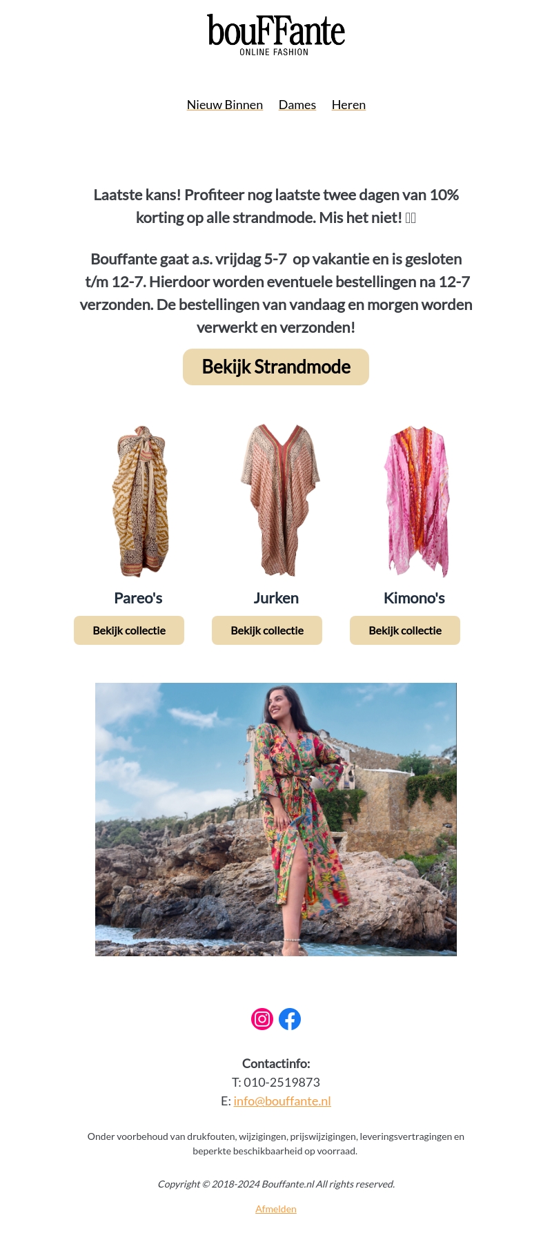 Laatste kans om te profiteren van 10% korting op alle strandmode bij Bouffante. De actie geldt nog twee dagen. Bekijk de prachtige collectie van pareo's, jurken en kimono's. Zorg dat je er snel bij bent, want Bouffante gaat binnenkort op vakantie. Bestellingen vandaag en morgen worden nog verwerkt en verzonden!