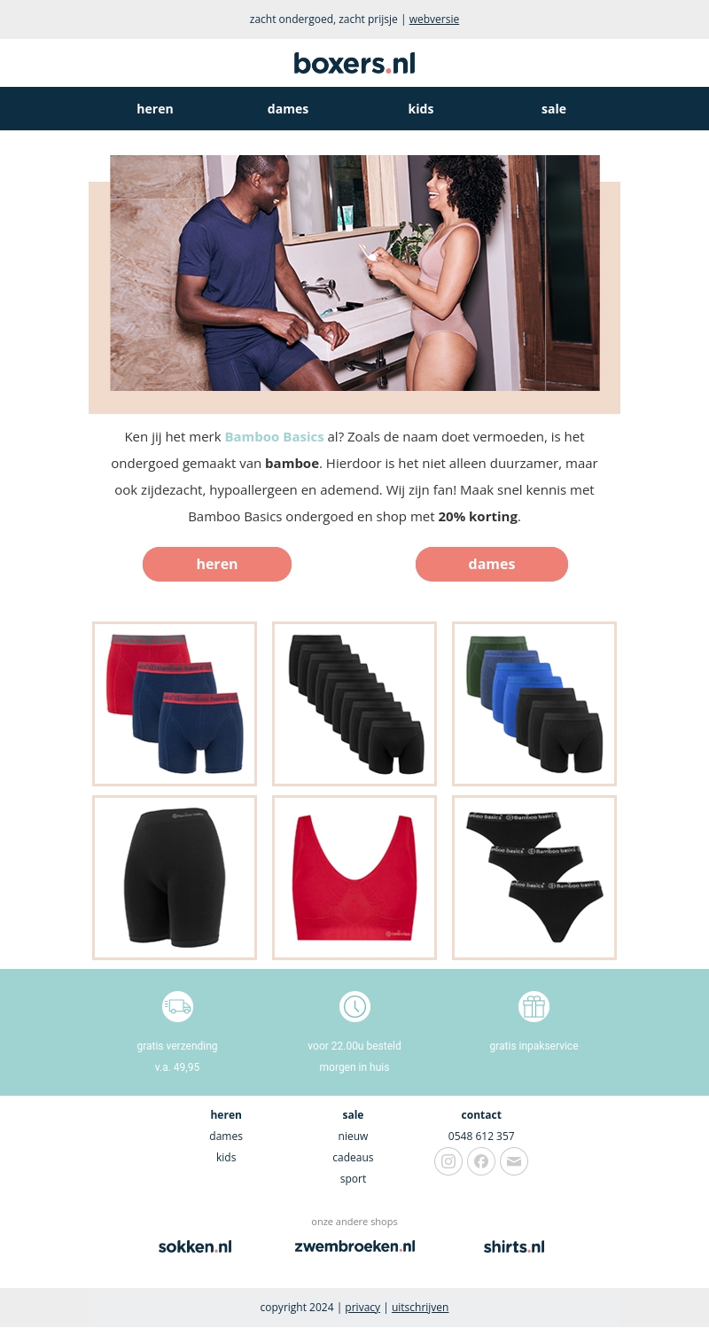 Ken jij het merk Bamboo Basics al? Het ondergoed is gemaakt van bamboe, wat het niet alleen duurzamer maakt, maar ook zijdezacht, hypoallergeen en ademend. Maak nu kennis met Bamboo Basics ondergoed en shop met 20% korting.