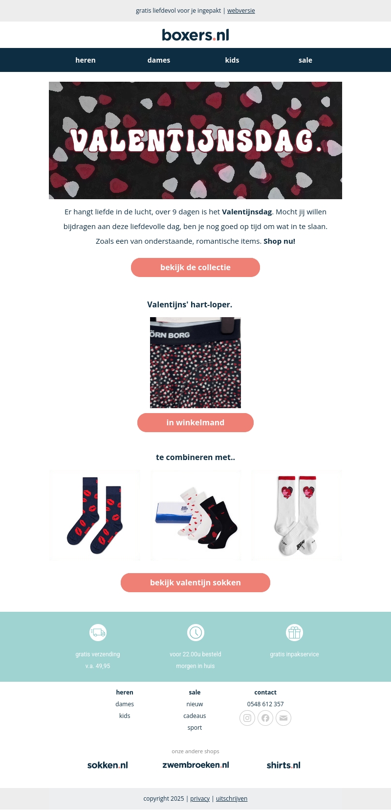 Valentijnsdag is bijna hier en wat is er beter dan een liefdevol cadeau van boxers.nl? Verken onze speciale collectie voor deze bijzondere dag. Of je nu op zoek bent naar speelse sokken of stijlvolle onderkleding, hier vind je wat je zoekt. Bovendien ontvang je gratis verzending vanaf โฌ49,95. Bestel voor 22.00 uur en het is morgen al in huis. Gratis inpakservice beschikbaar.