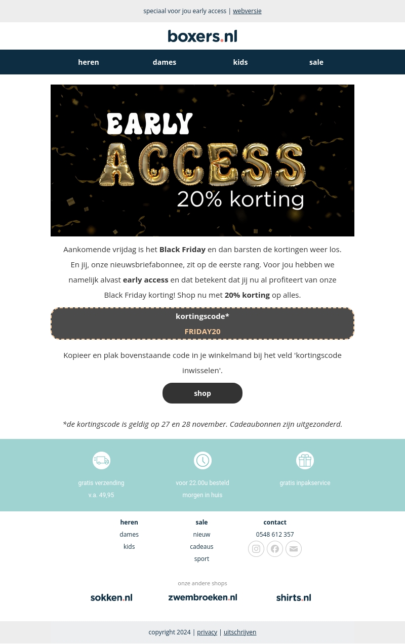 Aankomend weekend is het tijd voor Black Friday en daar hoort een speciale korting bij! Als nieuwsbriefabonnee krijg je exclusief early access met 20% korting op alles. Gebruik de kortingscode FRIDAY20 op 27 en 28 november. Pak je voordeel en shop nu met deze speciale aanbieding.