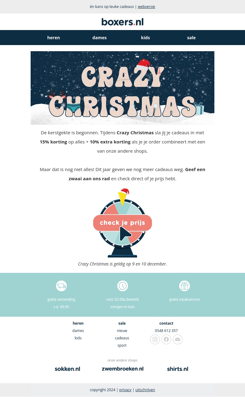 De kerstgekte is hier met Crazy Christmas op boxers.nl! Geniet van een geweldige 15% korting op alles. Combineer bestellingen met andere shops voor extra 10% korting. Mis de kans niet om fantastische cadeaus te scoren en geef een draai aan ons rad om direct je prijs te checken. Geldig op 9 en 10 december. Gratis verzending vanaf โฌ49,95.