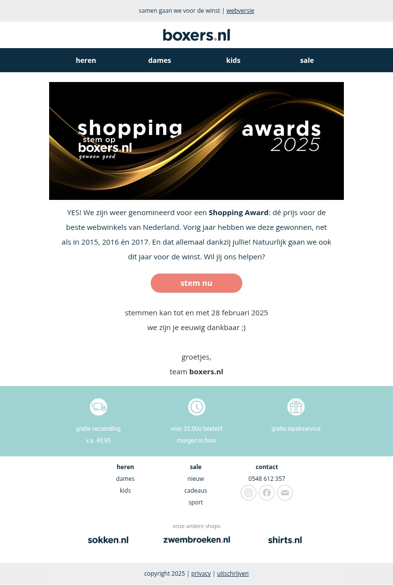 Boxers.nl is opnieuw genomineerd voor de Shopping Awards, een prijs voor de beste webwinkels van Nederland. Vorig jaar en voorgaande jaren waren we winnaars dankzij jullie steun. We roepen je op om ook dit jaar op ons te stemmen. Stemmen kan tot en met 28 februari 2025. Jouw steun betekent veel voor ons!