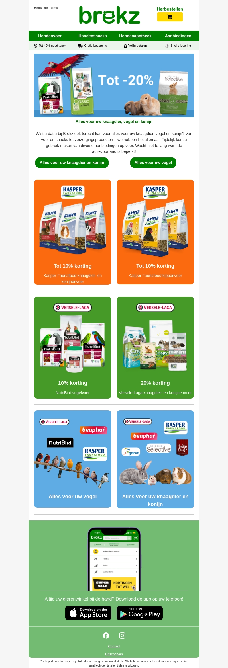 Bij Brekz vindt u nu aantrekkelijke kortingen op producten voor uw knaagdier, vogel en konijn. Van voer tot snacks en verzorgingsproducten, we hebben het allemaal. Haast u, want de voorraad is beperkt.