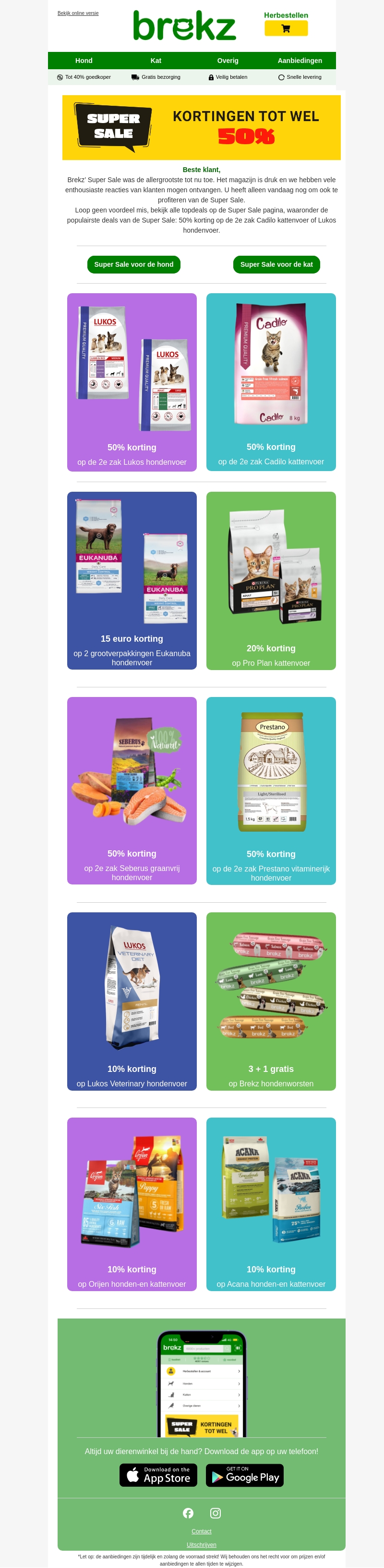 Mis het niet! Vandaag is de laatste dag van de Super Sale bij Brekz.nl. Geniet van kortingen tot wel 50% op populaire merken honden- en kattenvoer. Snelle levering, gratis verzending en veilig betalen! Shop nu voor de beste deals voor uw huisdier.