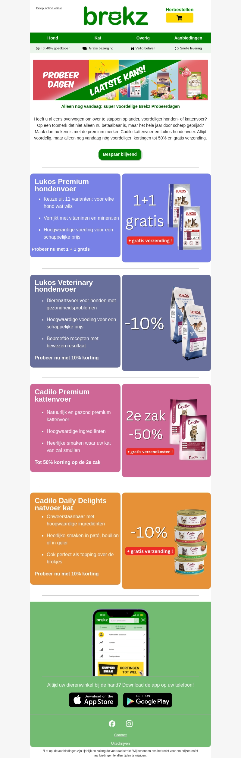 Vandaag is de allerlaatste kans om te genieten van de voordelige Brekz Probeer Dagen. U kunt profiteren van geweldige kortingen tot 50% op Cadilo kattenvoer en Lukos hondenvoer. Er zijn aanbiedingen zoals 1+1 gratis, 10% korting en gratis verzending beschikbaar. Zorg ervoor dat u deze unieke kans niet mist om uw huisdier van premium voeding te voorzien.
