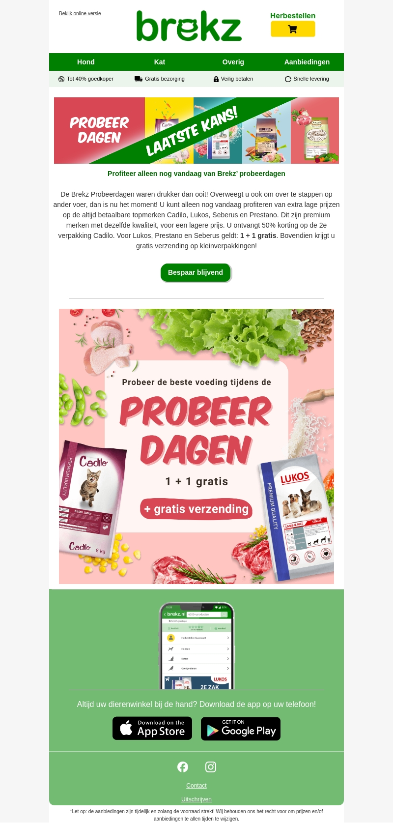 De Brekz Probeerdagen zijn bijna voorbij! Vandaag is uw laatste kans om voordelig de beste voeding voor uw huisdier aan te schaffen. Kies uit topmerken zoals Cadilo, Lukos, Seberus en Prestano met exclusieve kortingen, zoals 50% korting op de tweede verpakking van Cadilo en 1+1 gratis voor Lukos, Prestano en Seberus. Bovendien krijgt u gratis verzending op kleinverpakkingen.