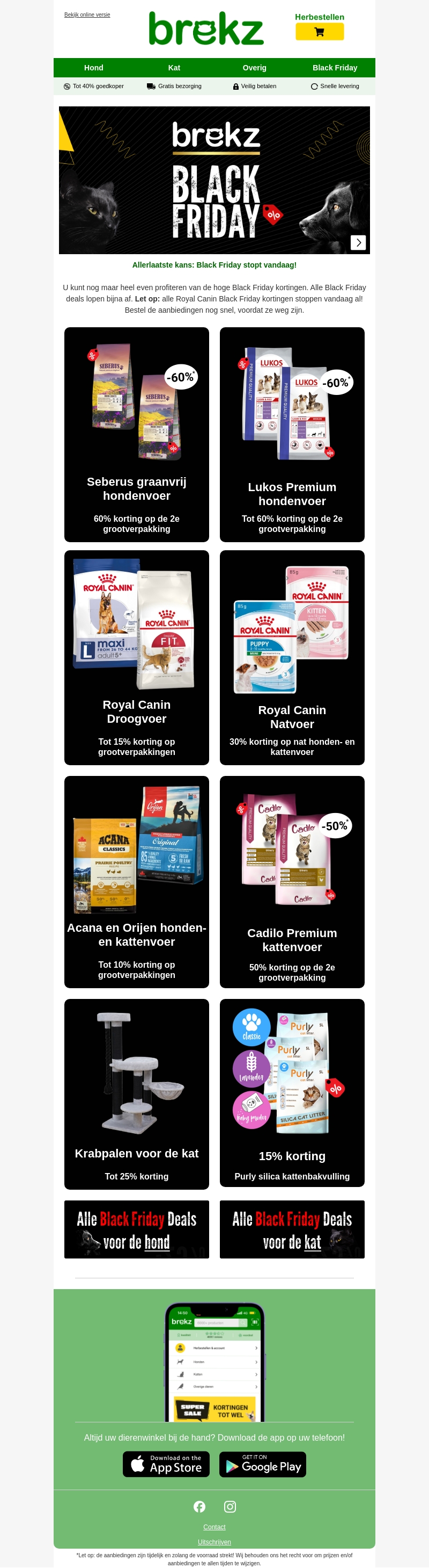 Dit is uw allerlaatste kans om te profiteren van enorme kortingen tijdens de Brekz Black Friday sale. Van Seberus en Lukos hondenvoer tot Royal Canin en Acana producten, er zijn kortingen tot wel 60%! Haast u, want deze aanbiedingen gelden slechts tijdelijk. Ontdek deals voor zowel honden als katten.