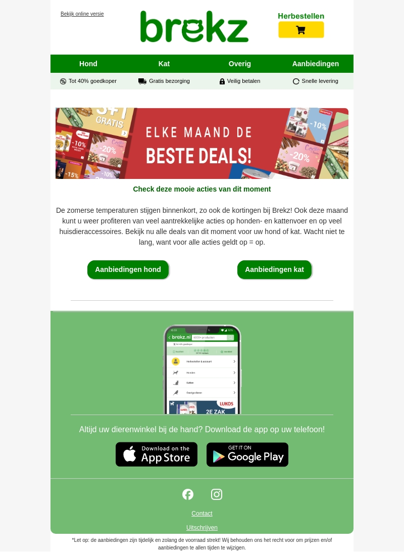 De zomerse temperaturen stijgen, net als de kortingen bij Brekz! Profiteer deze maand van geweldige aanbiedingen op hondenvoer, kattenvoer en huisdieraccessoires. Wacht niet te lang, want op=op!