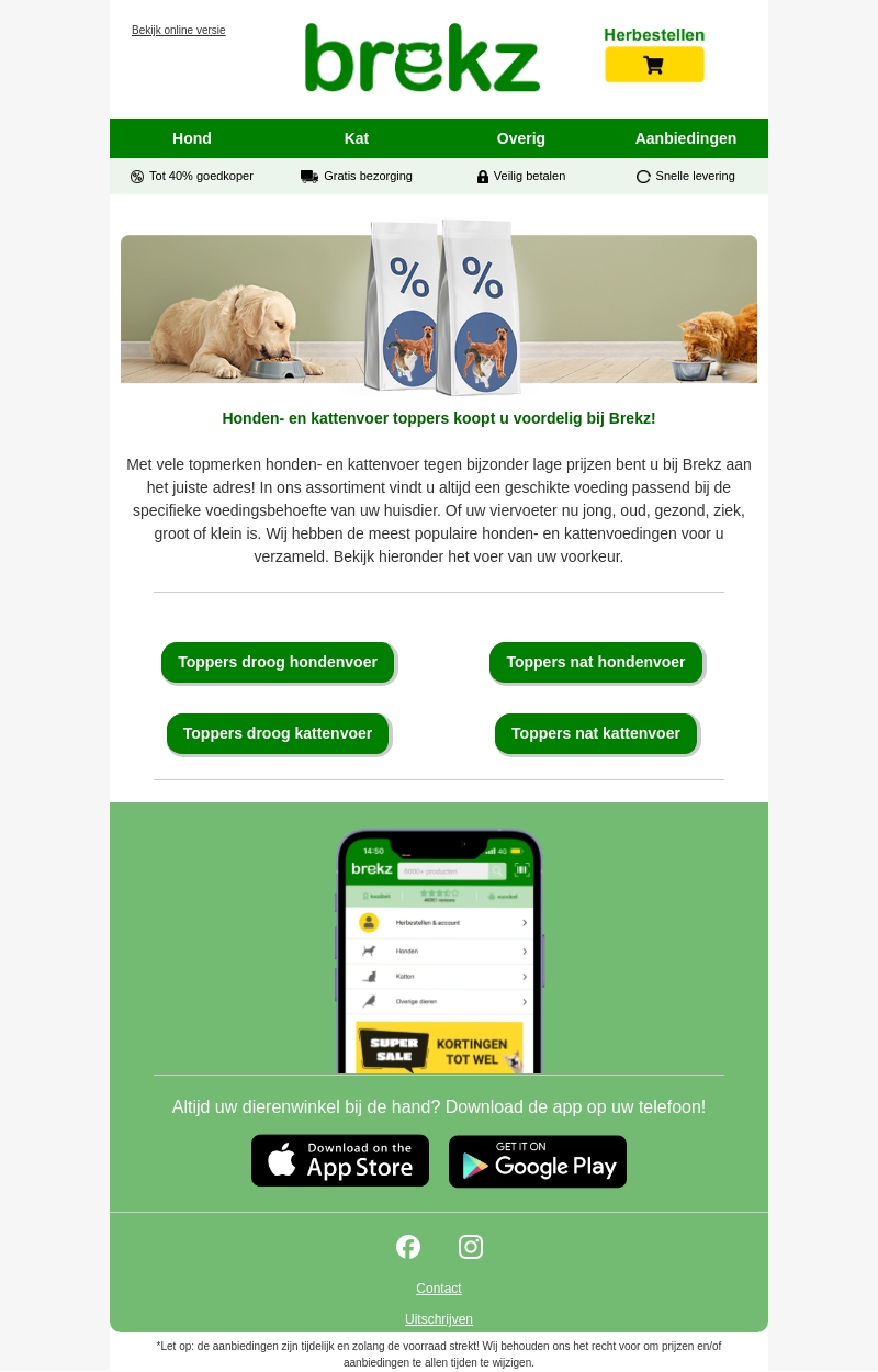 Bij Brekz vindt u de beste merken honden- en kattenvoer tegen lage prijzen. Of uw huisdier nu jong, oud, gezond of ziek is, Brekz heeft de juiste voeding. Profiteer van kortingen tot 40% en gratis verzending. Bekijk ons aanbod van droog en nat voer. Ontdek het voer dat bij uw voorkeur past.