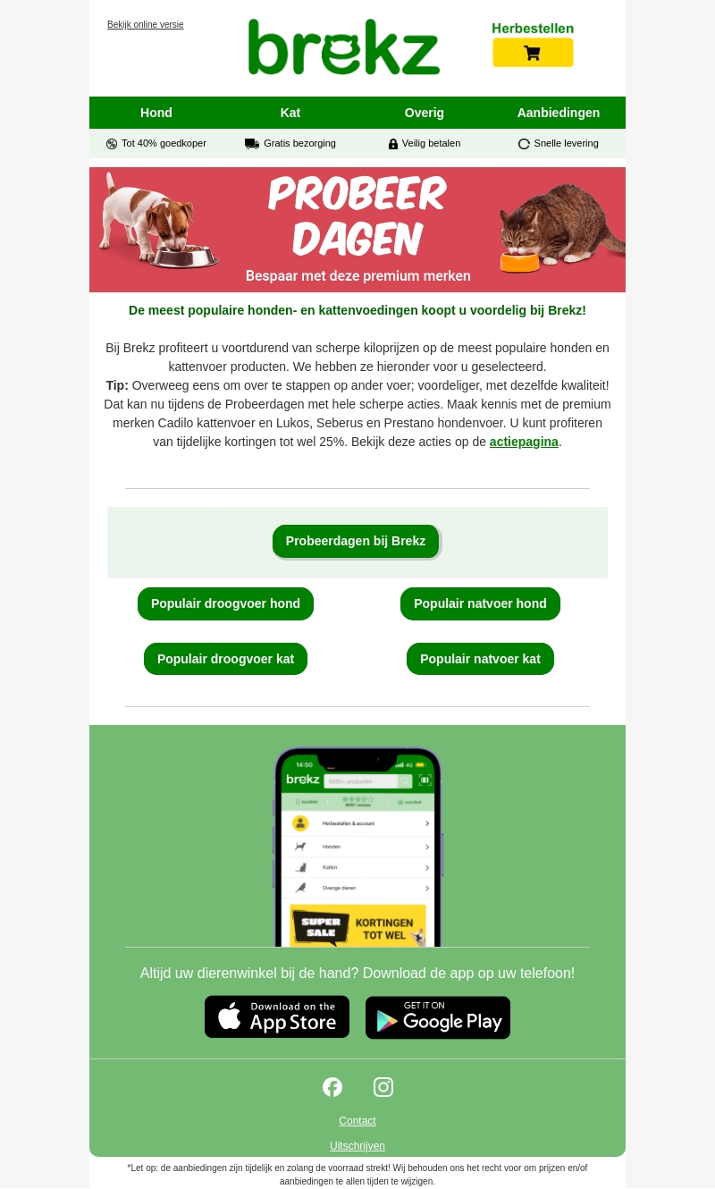 Bij Brekz vindt u de meest populaire honden- en kattenvoeding met aanzienlijke kortingen tot 25%. Tijdens de Probeerdagen kunt u kennismaken met premium merken zoals Cadilo, Lukos, Seberus en Prestano. Profiteer van de scherpe acties en overweeg om over te stappen op voordeliger voer van dezelfde kwaliteit. Bekijk alle aanbiedingen op onze actiepagina en bespaar met deze premium merken.