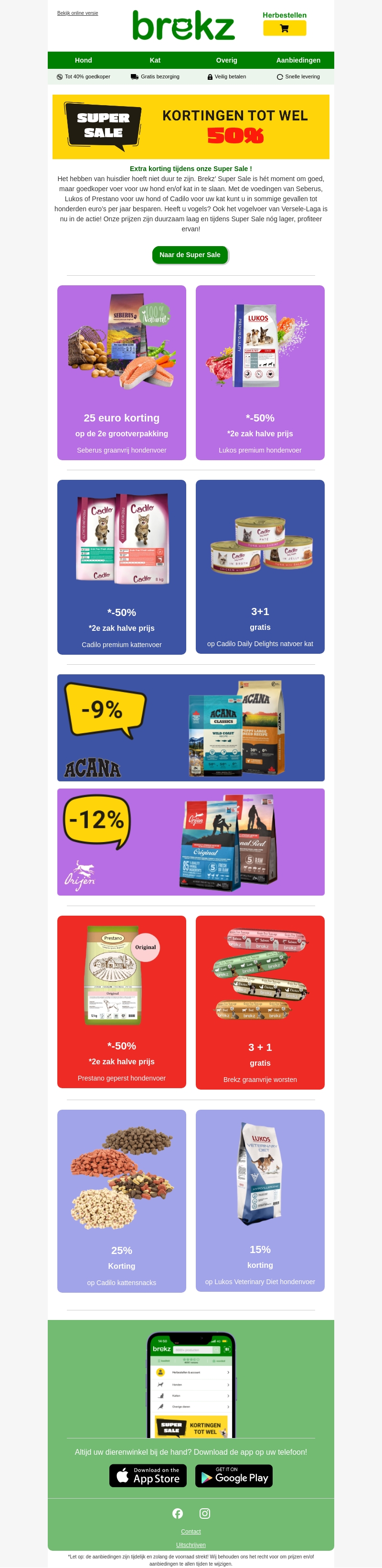 Geniet van de Brekz Super Sale met kortingen tot wel 50% op diverse producten. Van premium hondenvoer tot kattensnacks, er is voor ieder huisdier wat wils. Haal meer voordeel uit uw aankopen met exclusieve aanbiedingen. Mis het niet en shop vandaag nog. Bekijk ook onze handige app voor meer deals.