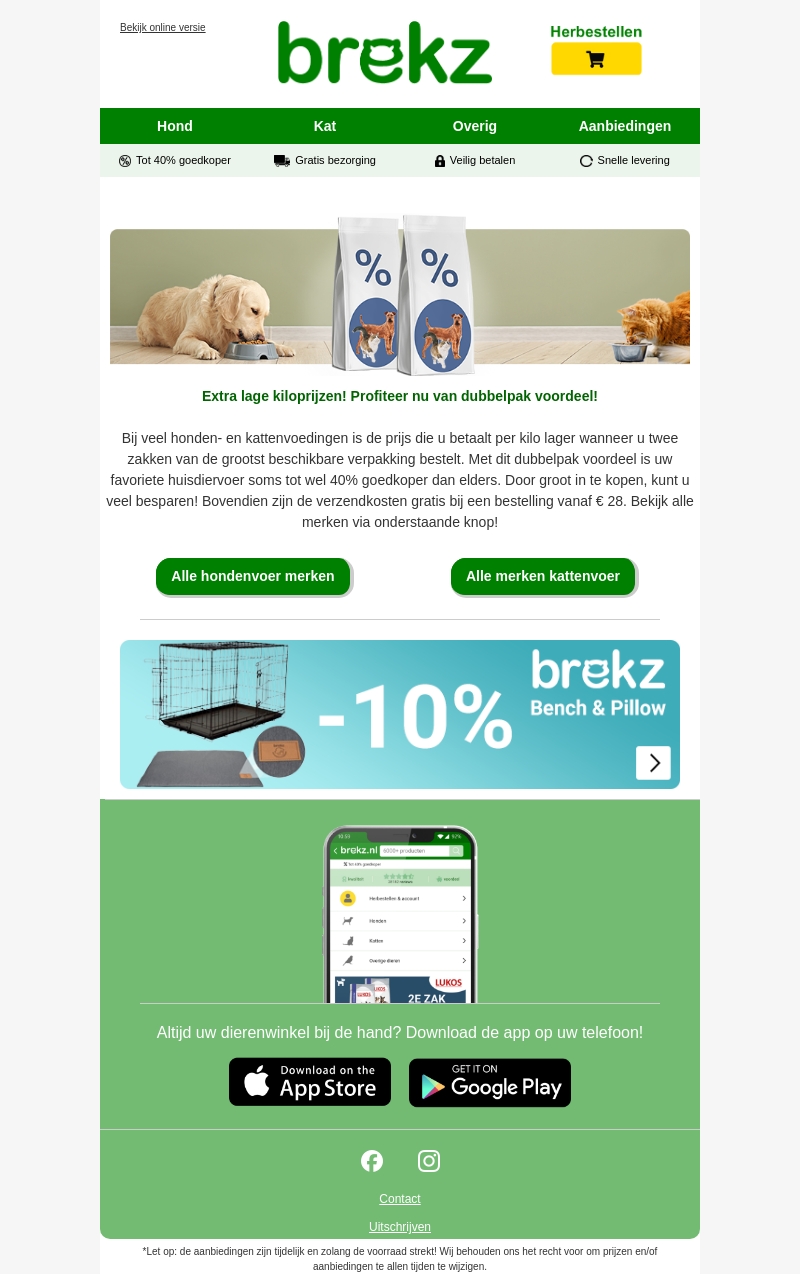 Ontdek de nieuwste aanbiedingen voor honden- en kattenvoeding bij Brekz. Met ons dubbelpak voordeel bespaart u tot wel 40% op uw favoriete merken. Bovendien geniet u van gratis verzending bij bestellingen vanaf €28. Profiteer nu en bekijk alle merken!