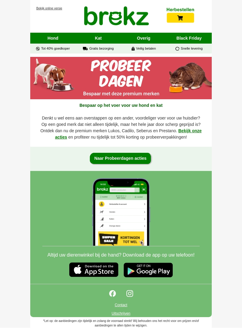 Brekz lanceert speciale Probeer Dagen voor honden- en kattenvoer. Profiteer van tot 50% korting op premium merken zoals Lukos, Cadilo, Seberus en Prestano. Bezoek onze website voor tijdelijke acties en ontdek voordelige proefverpakkingen. Mis deze kans niet om uw huisdier te verwennen met kwaliteitsvoer tegen een aantrekkelijke prijs.