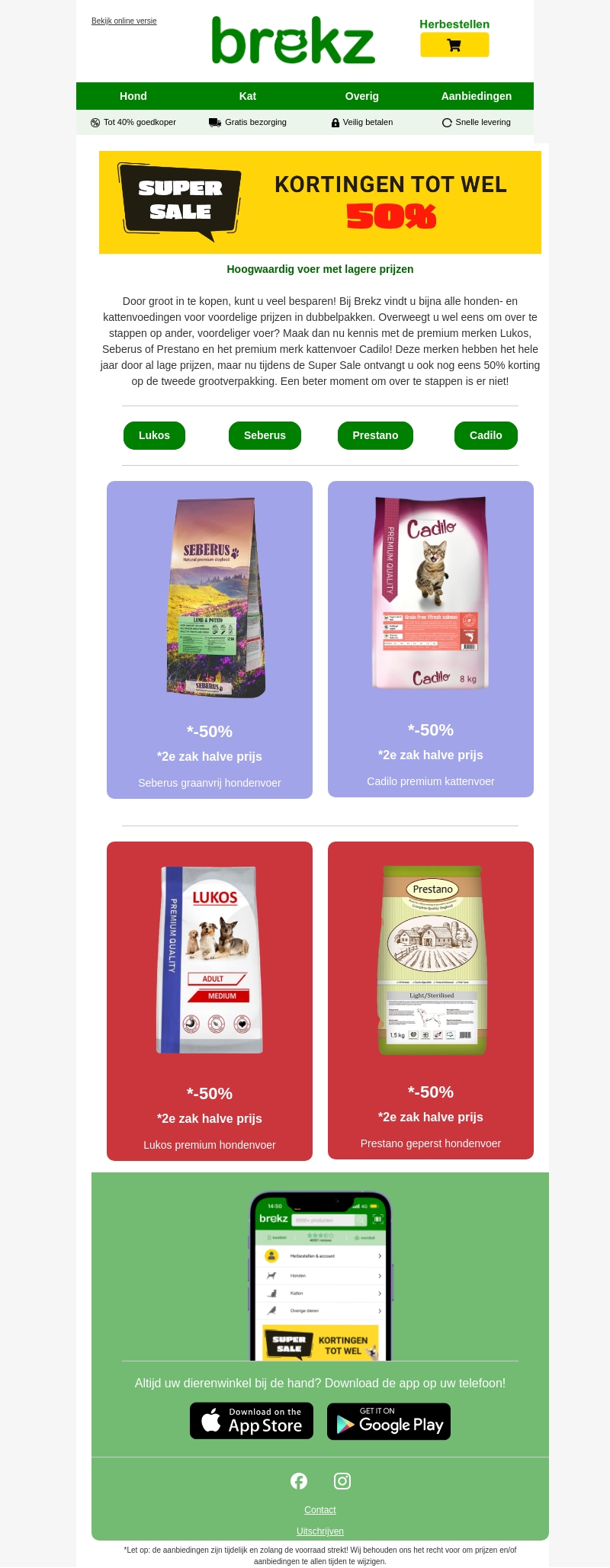 Profiteer van onze geweldige Super Sale bij Brekz! Bespaar tot wel 50% op premium honden- en kattenvoer van merken zoals Lukos, Seberus, Prestano en Cadilo. Deze aanbiedingen gelden tijdens de Super Sale en geven je 50% korting op de tweede grootverpakking. Bekijk onze selectie en zorg ervoor dat je huisdieren het beste krijgen, voor minder.