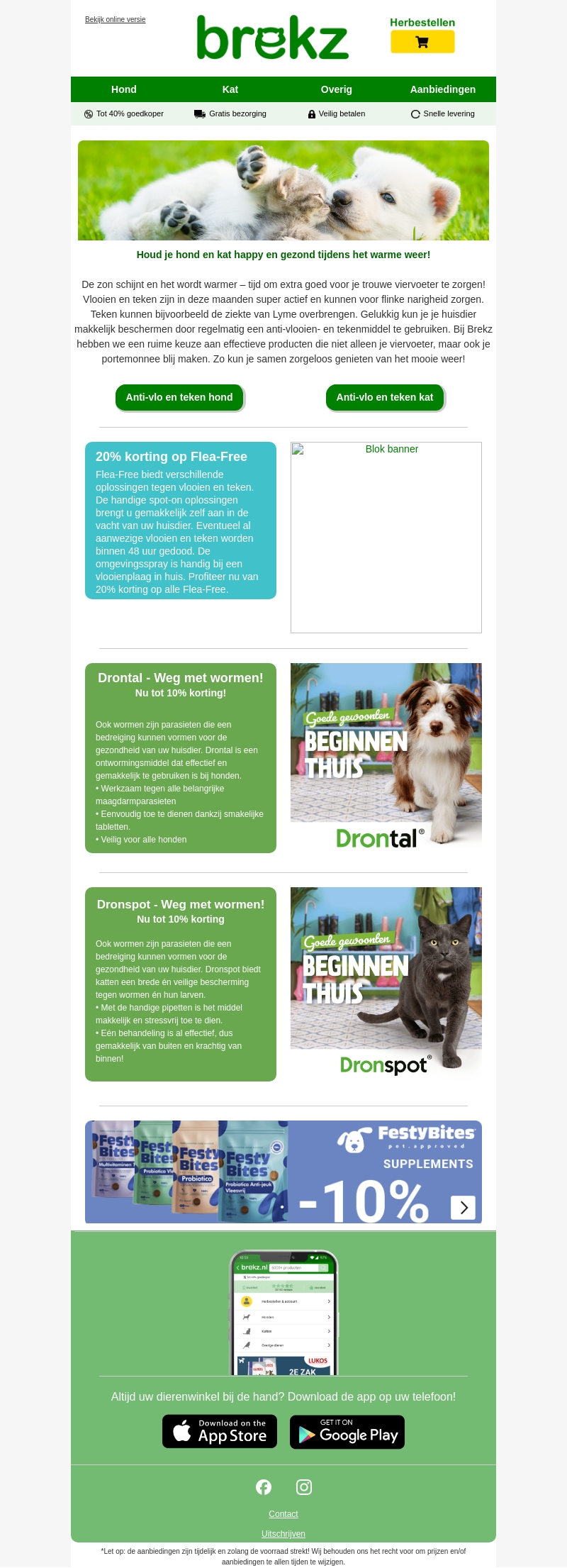 De zomer komt eraan en vlooien en teken worden weer actiever. Bescherm je huisdier met onze effectieve anti-vlooien en tekenmiddelen. Profiteer nu van 20% korting op Flea-Free producten. Vergeet ook niet onze Drontal en Dronspot tegen wormen, nu met 10% korting.
