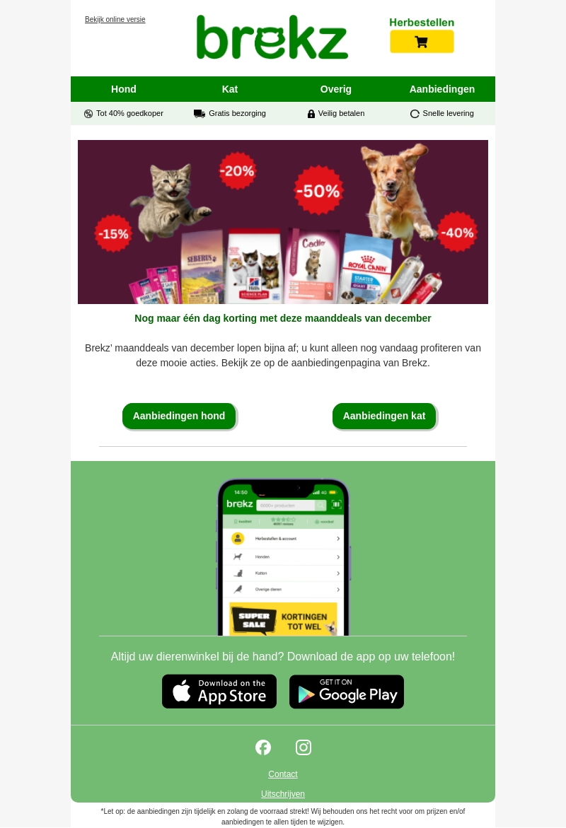Brekz biedt nog maar één dag de exclusieve maanddeals van december aan. U kunt kortingen tot wel 50% scoren op hond- en kattensnacks. Mis deze kans niet om uw favoriete producten voordelig aan te schaffen.