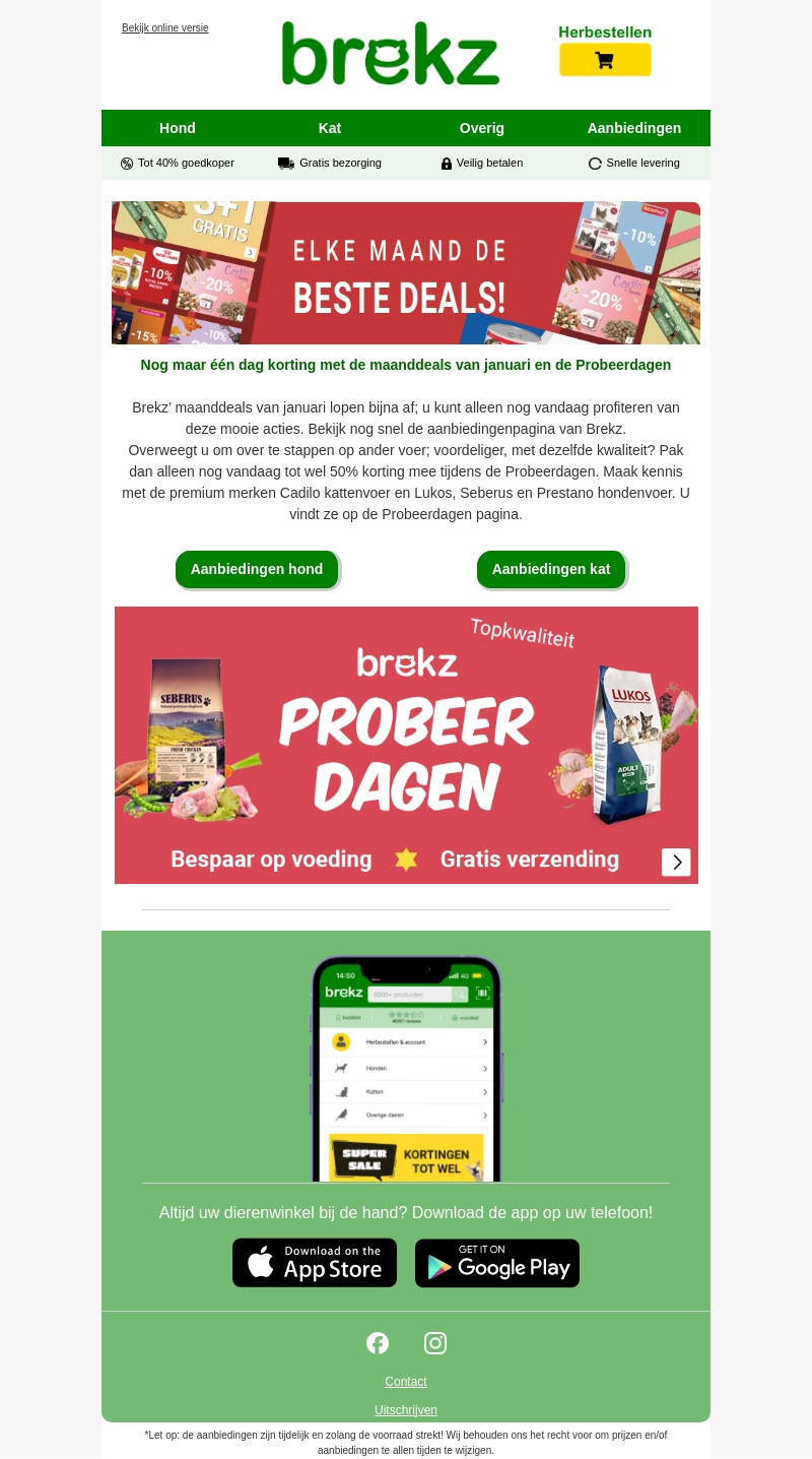 Brekz' maanddeals van januari bieden u de laatste kans om te besparen op premium dierenvoer. Alleen vandaag kunt u nog gebruikmaken van kortingen tot 50% tijdens de Probeer Dagen. Mis het niet en ontdek de aanbiedingen op Cadilo kattenvoer en Lukos, Seberus en Prestano hondenvoer.