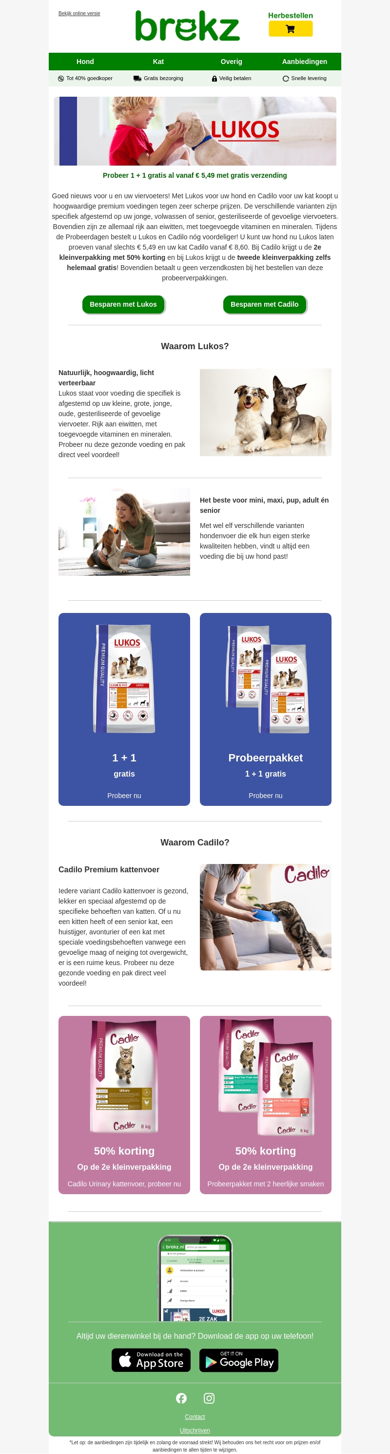 Goed nieuws voor uw viervoeters! Probeer nu Lukos voor honden en Cadilo voor katten met een tijdelijke aanbieding: 1 + 1 gratis vanaf €5,49. Onze premium voedingen zijn perfect voor uw viervoeters en speciaal afgestemd op hun behoeften. Bestel nu en profiteer van gratis verzending.