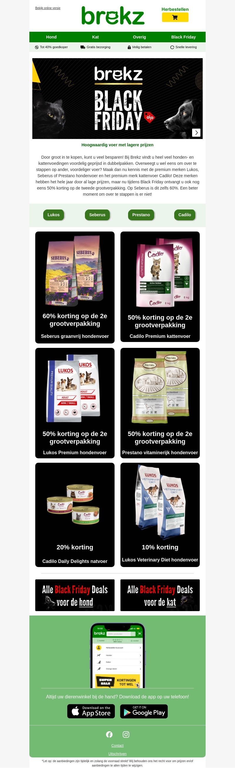 Bij Brekz kunt u nu profiteren van fantastische Black Friday kortingen op diverse honden- en kattenvoeding. Ontdek topproducten zoals Sebereus en Cadilo met tot wel 60% korting bij aankoop van een tweede grootverpakking. Verwen uw huisdieren met premium voeding voor minder deze feestdagen!