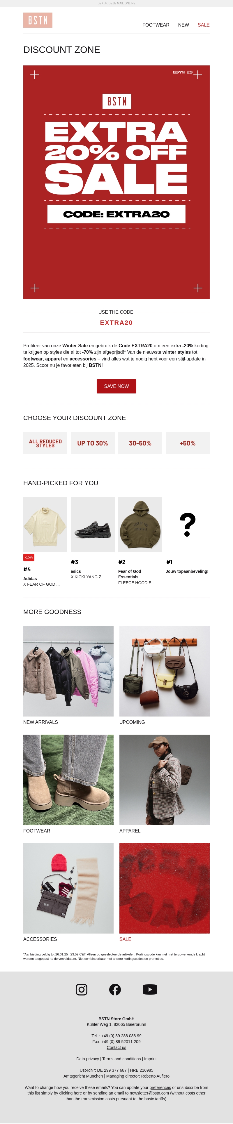 Bezoek de BSTN Discount Zone en ontvang een extra 20% korting op alle reeds afgeprijsde items! Gebruik de code EXTRA20 om te profiteren van deze geweldige aanbieding. Ontdek de nieuwste winteruitvoeringen in schoenen, kleding en accessoires. Alle stijlen zijn sterk afgeprijsd, variΓ«rend van 30% tot 70% korting. Mis deze kans niet om uw garderobe voordelig bij te werken!