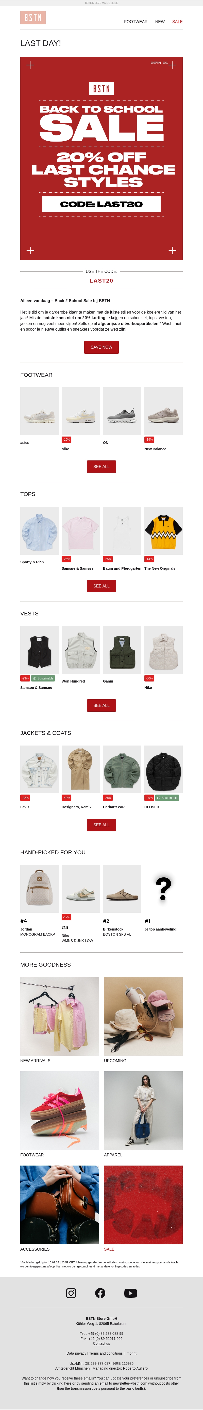 Alleen vandaag biedt BSTN 20% korting op hun Last Chance-stijlen. Dit is je laatste kans om grote kortingen te krijgen op een breed assortiment van schoenen, tops, vesten, en jassen. Gebruik de kortingscode LAST20 voor de korting en bekijk de exclusieve selectie voordat het te laat is.