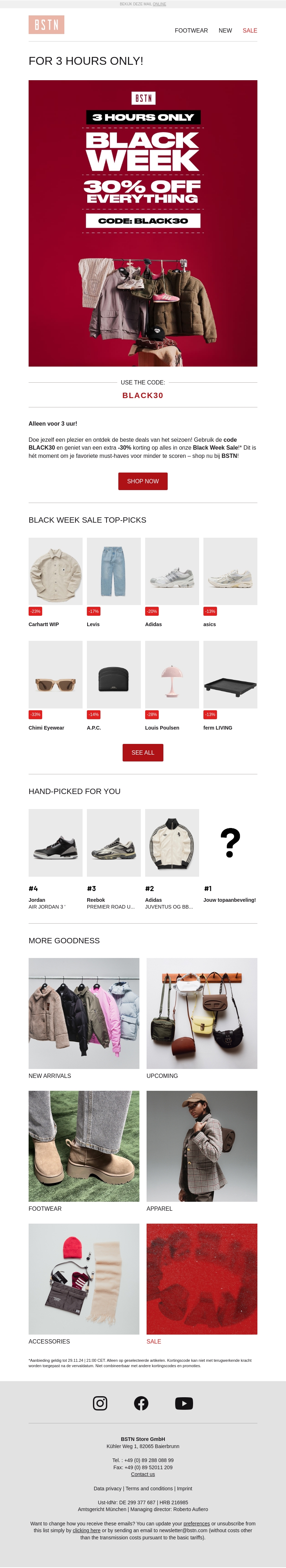 Sla nu je slag met de Black Week Sale, geldig voor slechts 3 uur! Profiteer van 30% korting op je favoriete items van topmerken zoals Carhartt WIP, Adidas en meer. Vergeet niet de code BLACK30 te gebruiken bij het afrekenen. Shop snel voor de tijd om is!
