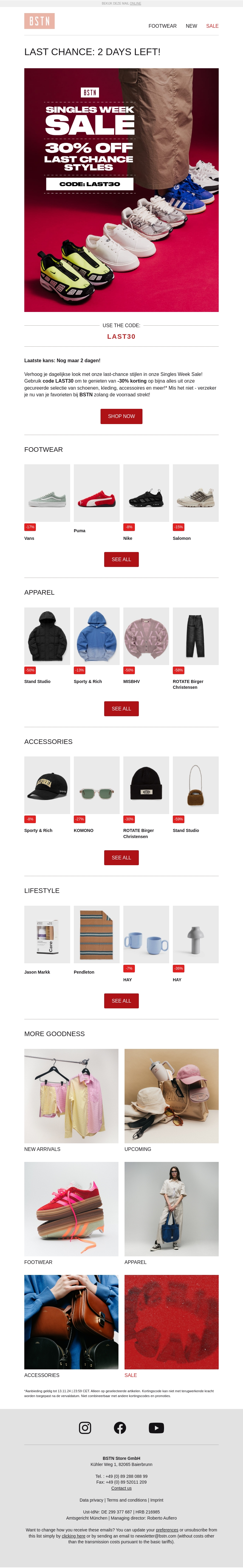 Ontdek de spectaculaire kortingen van 30% op laatste kans stijlen bij BSTN. Van trendy schoeisel tot stijlvolle kleding, grijp nu je favoriete items. Wees er snel bij, want de voorraad is beperkt en de actie geldt slechts twee dagen. Update je garderobe met topmerken en profiteer van geweldige deals. Gebruik de code LAST30 voor extra voordeel.