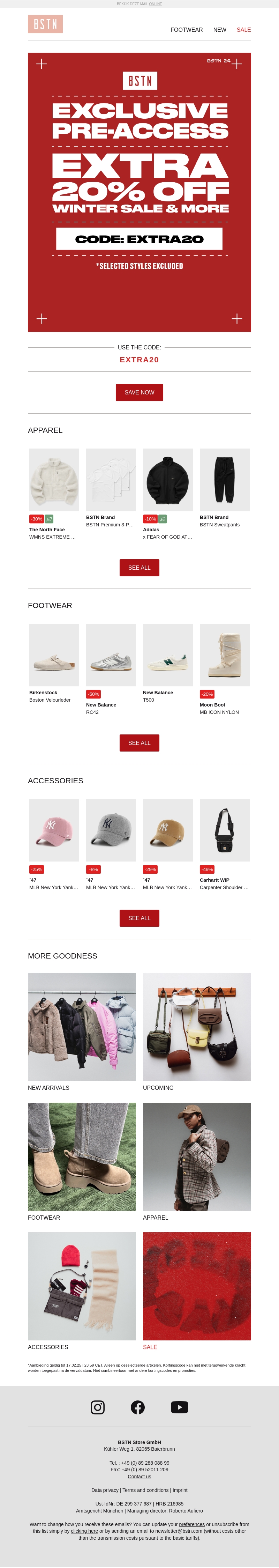 Profiteer van exclusieve pre-access bij BSTN en ontvang 20% extra korting op hun uitgebreide Winter Sale. Ontdek stijlvolle kleding, schoeisel en accessoires van topmerken zoals The North Face en Adidas. Deze aanbieding is maar tijdelijk, dus wacht niet te lang. Er zijn enkele uitzonderingen van toepassing. Gebruik code EXTRA20 om van de korting te genieten.