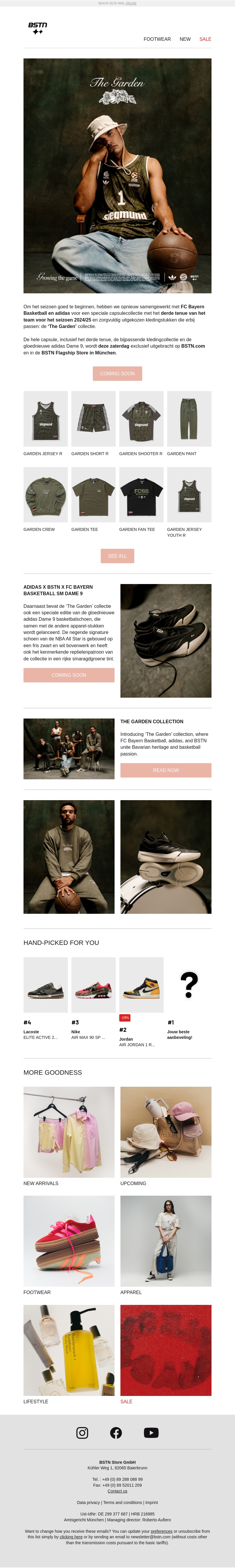 Ontdek de exclusieve 'The Garden' collectie, een samenwerking tussen FC Bayern Basketball, adidas en BSTN. Deze bijzondere lijn omvat stijlvolle outfits en schoenen geïnspireerd door sport en mode. Mis het niet, binnenkort beschikbaar online en in de BSTN Flagship Store in München!