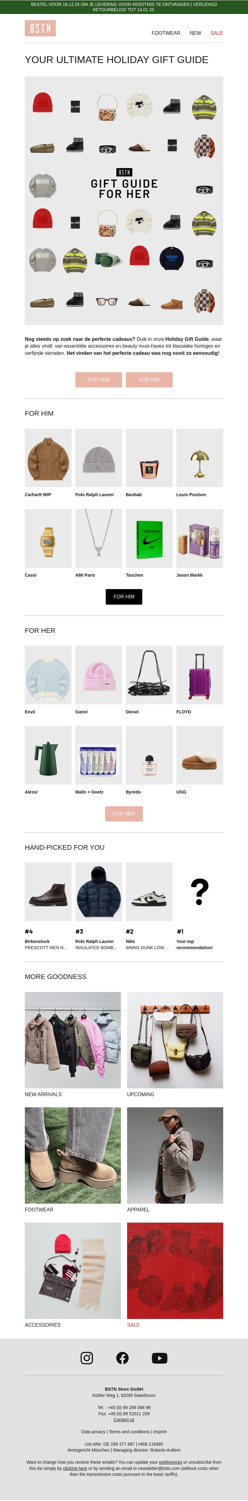Ben je nog op zoek naar het perfecte cadeau? De Holiday Gift Guide biedt een uitgebreide selectie van stijlvolle en praktische geschenken. Van mode tot accessoires, we hebben alles voor hem en haar. Laat je inspireren door onze handgeselecteerde aanbevelingen en maak het winkelen deze feestdagen eenvoudiger. Mis de nieuwe binnenkomers en aankomende aanbiedingen niet. Ontdek vandaag nog jouw ideale cadeau!