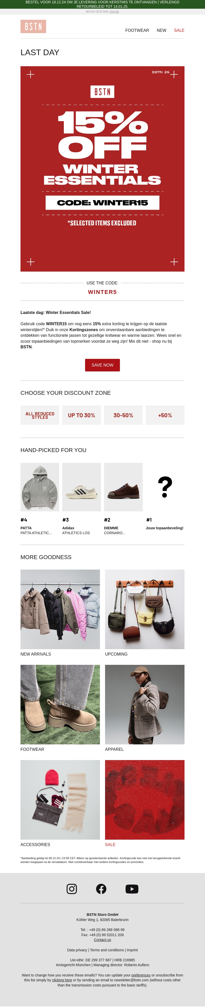 Ontdek de ongeëvenaarde aanbiedingen in onze Kortingzone bij BSTN! Gebruik code WINTER15 voor 15% extra korting op geselecteerde winteressentials. Van jassen tot warme laarzen, bereidt je voor op de winter. Wees snel, want de winteruitverkoop eindigt snel. Vergeet niet, topaanbiedingen zijn slechts tijdelijk beschikbaar.