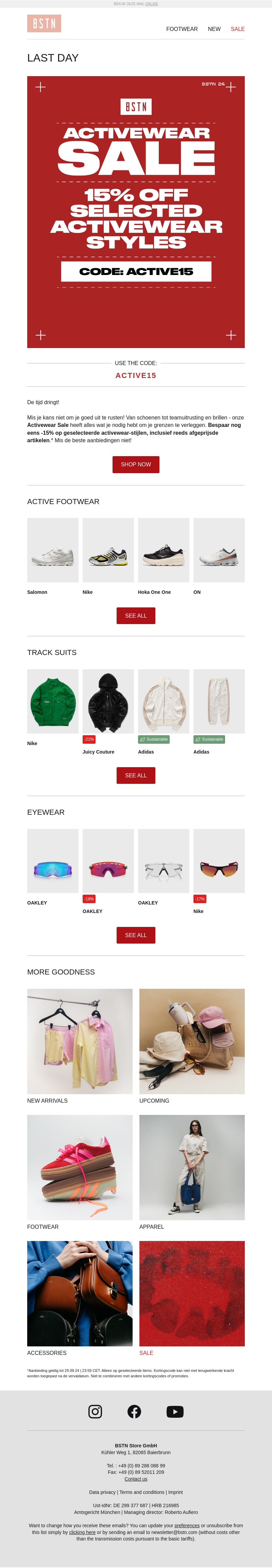 Het is de laatste dag om van 15% korting te profiteren op geselecteerde activewear-producten. Van sportschoenen tot trainingspakken, bespaar nu op je favoriete merken zoals Nike, Adidas en meer. Gebruik de code: ACTIVE15. Mis deze geweldige aanbieding niet!