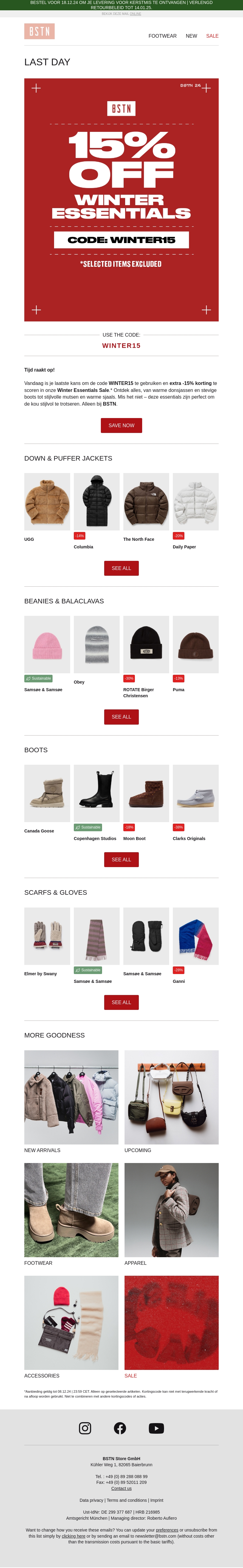 Vandaag is de laatste kans om te profiteren van 15% korting op winter essentials! Van jassen tot accessoires, bereid je voor op de kou met stijlvolle aanbiedingen. Mis deze kans niet om je wintergarderobe uit te breiden. Gebruik de code WINTER15 bij het afrekenen. Alleen geldig vandaag, dus wacht niet te lang!