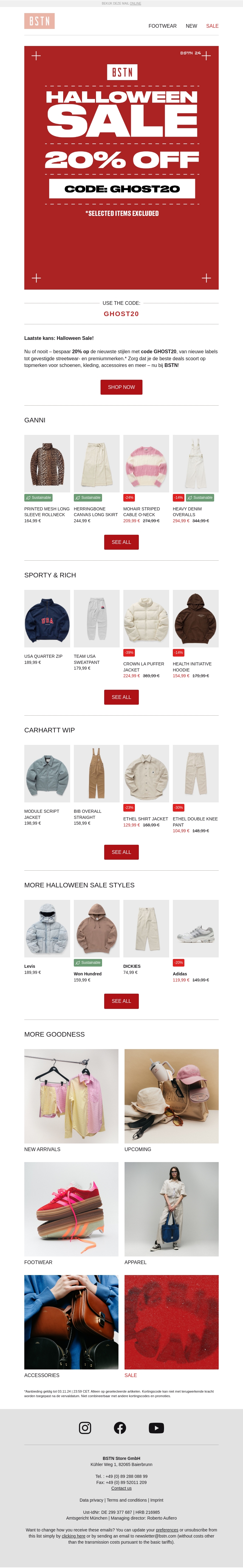 Grijp je kans op de laatste dag van de spectaculaire Halloween Sale met een korting van 20% op geselecteerde topmerken! Gebruik de code GHOST20. Mis deze kans niet om je favoriete items in te slaan met een geweldige korting. Bekijk het assortiment van merken als GANNI, Sporty & Rich, en Carhartt WIP. Een geweldige kans om je garderobe bij te werken. Shop voordat de voorraad op is!
