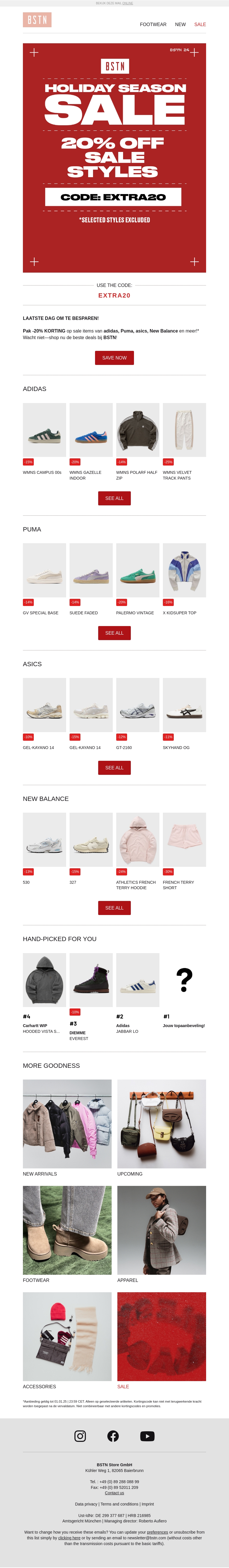 Profiteer van de laatste dag om extra te besparen met een exclusieve korting van 20% op geselecteerde sale-stijlen. Van bekende merken zoals Adidas, Puma en New Balance biedt deze deal geweldige kansen om je garderobe uit te breiden. Zorg dat je de code EXTRA20 gebruikt bij het afrekenen. Deze aanbieding is beperkt tot geselecteerde stijlen, dus wees er snel bij! Verwen jezelf of vind het perfecte cadeau. Mis deze kans niet!