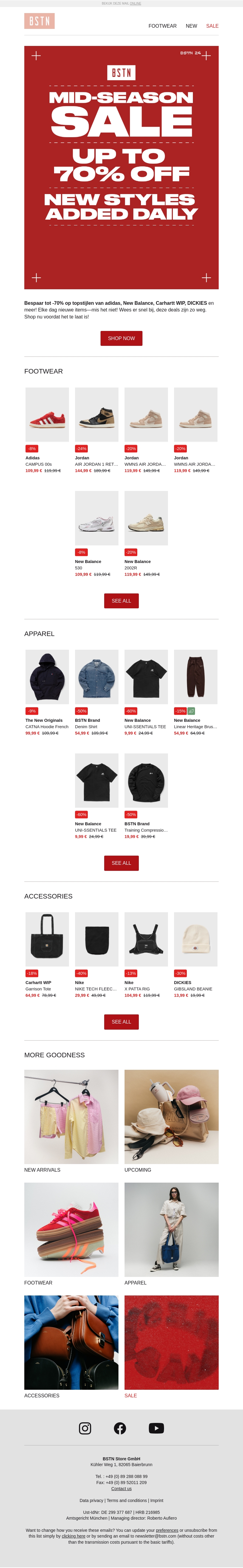 Profiteer van kortingen tot 70% tijdens onze Mid-Season Sale. Ontdek de nieuwste stijlen van topmerken zoals adidas, New Balance en Carhartt WIP. Dagelijks worden er nieuwe items toegevoegd. Mis deze kans niet om je garderobe te updaten voor een fractie van de prijs. Bezoek onze site en ontdek de geweldige aanbiedingen.