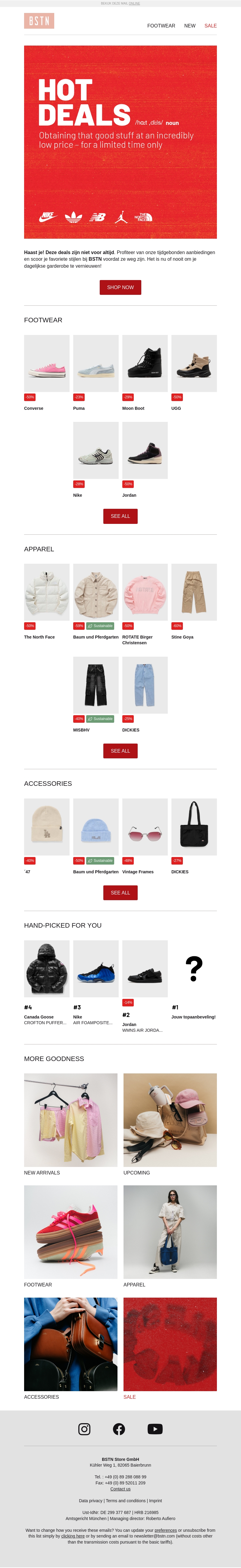 Onze nieuwste Hot Deals zijn hier! Profiteer van ongelooflijke kortingen op schoenen, kleding en accessoires van topmerken zoals Nike, Adidas, en The North Face. Alleen voor een beperkte tijd beschikbaar.