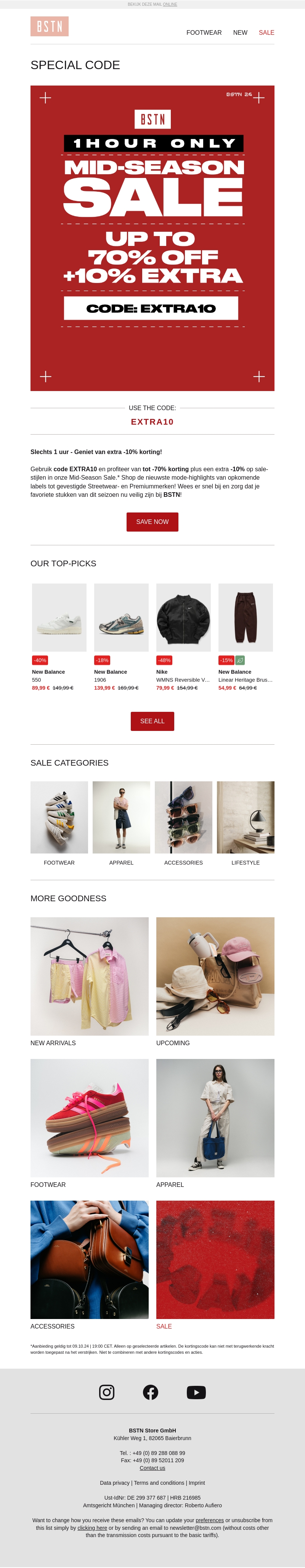 Slechts één uur om 10% extra korting te pakken bovenop de 70% korting in de Mid-Season Sale bij BSTN. Ontdek onze nieuwste mode-highlights met items van de beste merken. Zorg dat je snel bent, want deze aanbieding is van korte duur.