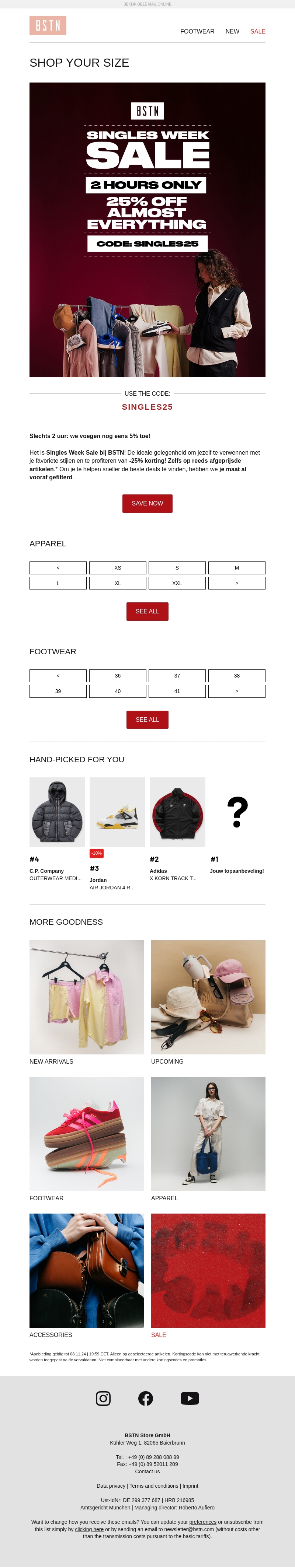 Mis het niet! Tijdens de Singles Week Sale krijg je slechts 2 uur lang 25% korting op bijna alles. Gebruik de code SINGLES25 voor deze fantastische aanbieding. Vind snel jouw favoriete items die al gefilterd zijn op maat. Ontdek nieuwste mode en accessoires bij BSTN. Wees er snel bij!