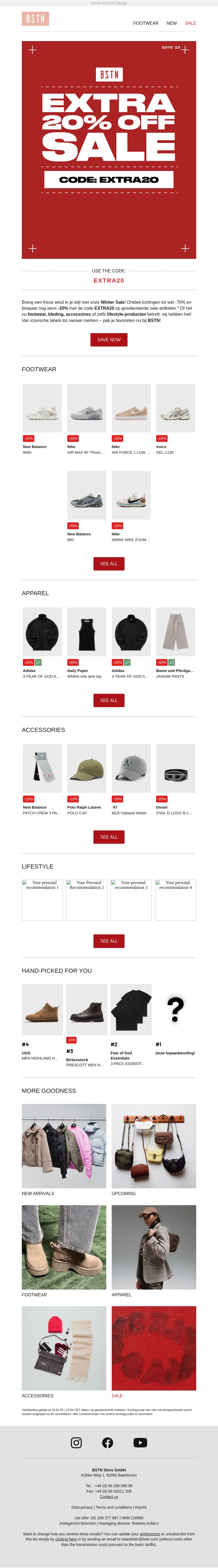 Profiteer van de indrukwekkende winteruitverkoop bij BSTN! Ontvang tot wel 70% korting op een breed assortiment aan schoenen, kleding en accessoires. Voeg daar nog eens een extra 20% korting aan toe met de code EXTRA20. Deze aanbieding geldt op geselecteerde artikelen en is tijdelijk beschikbaar. Sla je slag nu en vernieuw je garderobe met stijlvolle stukken. Ontdek de beste aanbiedingen voordat ze weg zijn!