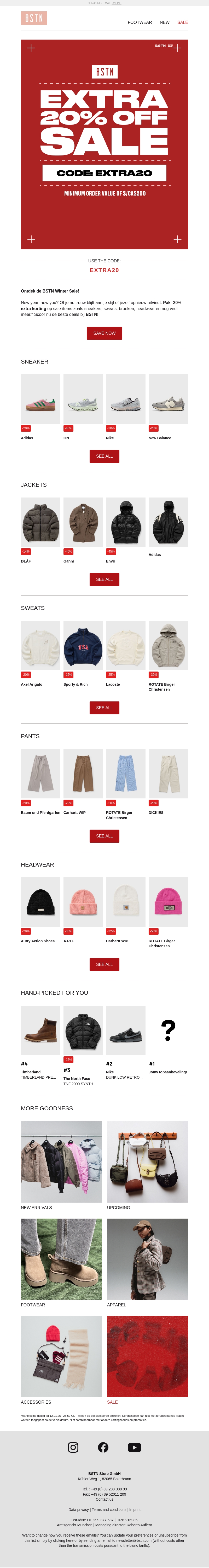 Geniet van de winteruitverkoop met 20% extra korting bij BSTN. Ontdek een scala aan stijlvolle items van topmerken zoals Adidas, Nike en meer. Verwen jezelf met de nieuwste sneakers, jassen en accessoires. Gebruik de code EXTRA20 voor extra besparingen. Ideaal voor fashion-forward shoppers.