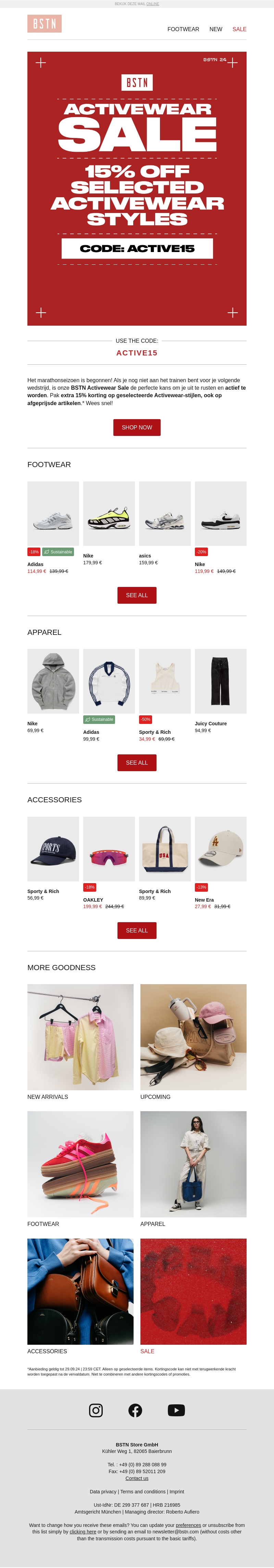 De activewear sale is begonnen bij BSTN. Profiteer nu van 15% korting op geselecteerde Activewear-stijlen met de code ACTIVE15. Deze aanbieding is geldig op een breed scala aan producten, waaronder schoenen, kleding en accessoires. Mis deze kans niet om jouw sportoutfit te upgraden.