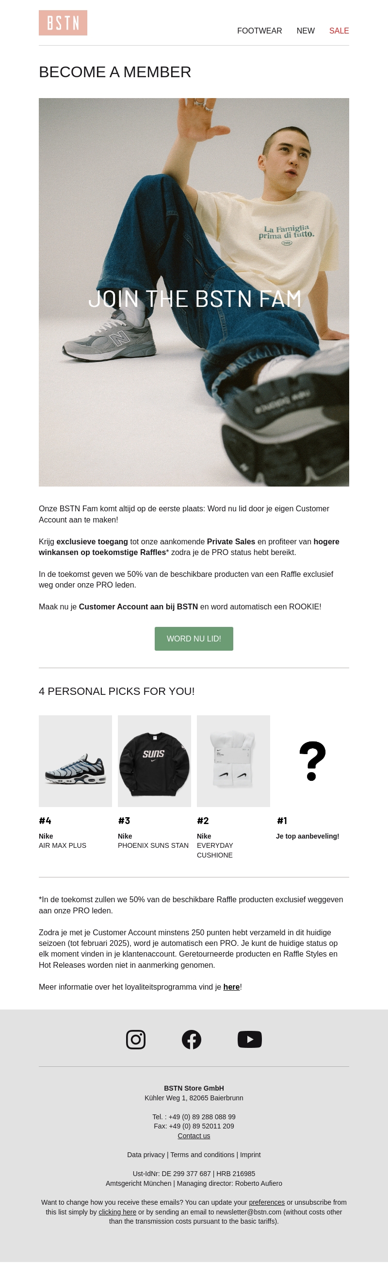 Meld je aan bij de BSTN Fam en geniet van exclusieve toegang tot private sales, hogere winkansen op toekomstige raffles en 50% korting op geselecteerde producten. Maak je Customer Account aan en word automatisch een ROOKIE met extra voordelen.
