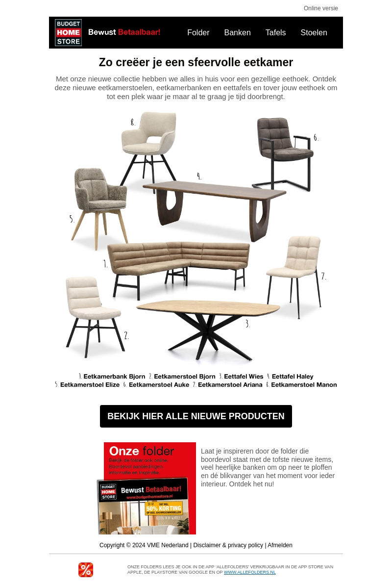 Met onze nieuwste collectie eetkamermeubels kun je eenvoudig een sfeervolle eetkamer creëren. Vind stijlvolle eettafels, comfortabele eetstoelen en praktische eetbanken. Transformeer jouw eetkamer tot een plek om gezellig samen te komen. Bekijk nu onze nieuwste producten en laat je inspireren door ons assortiment.