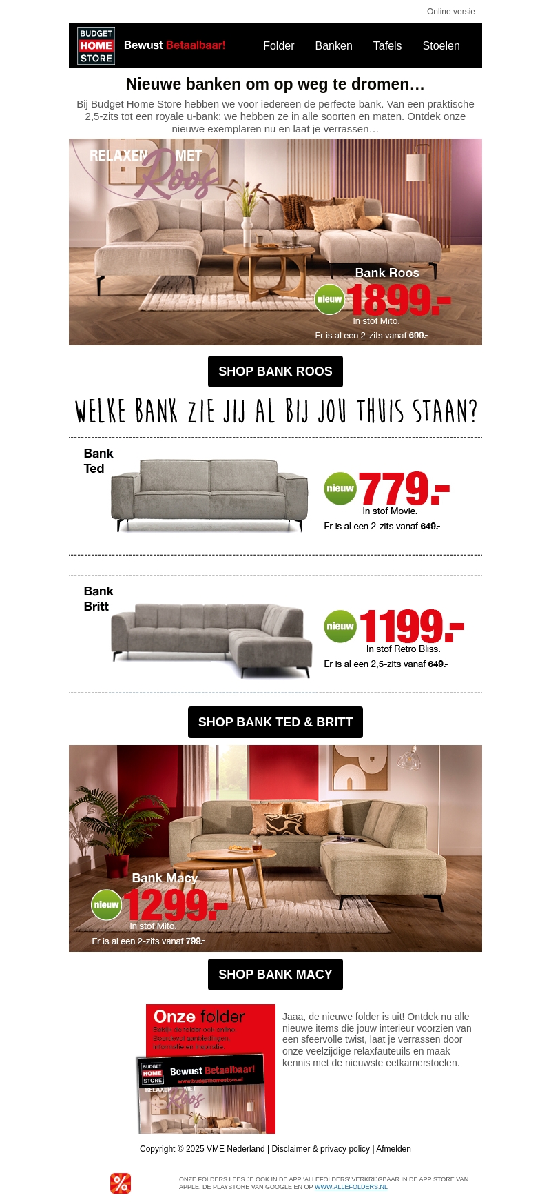 Budget Home Store presenteert een exclusieve collectie nieuwe banken. Of je nu houdt van een praktische 2,5-zits of een royale u-bank, er is voor ieder wat wils. Duik in de wereld van stoffen als Mito, Movie, en Retro Bliss voor een frisse uitstraling. Ontdek de veelzijdige modellen zoals Bank Roos, Ted, Britt en Macy. Laat je inspireren door de laatste interieurtrends met onze nieuwe brochure.