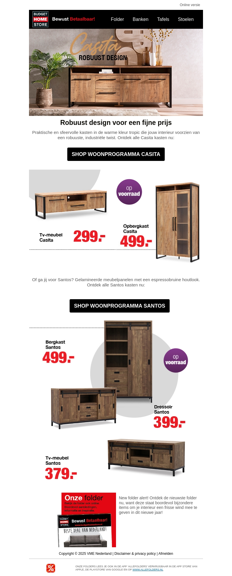 Ervaar het perfecte huwelijk van stijl en robuustheid met onze nieuwe collectie kasten en meubels. Verkrijgbaar in warme tropische kleuren, deze items brengen een industriële flair in je huis. Verken de Casita-serie voor speelse ontwerpen of kies voor de klassieke elegantie van de Santos-collectie. Met prijzen vanaf 299,- zijn deze meubels niet alleen betaalbaar, maar ook een waardevolle aanvulling op je interieur. Bekijk de nieuwe folder voor meer inspiratie.