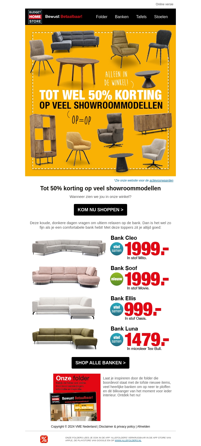 Bezoek de Budget Home Store en ontdek indrukwekkende kortingen tot wel 50% op diverse showroommodellen. Perfect om je woonkamer een nieuwe look te geven met comfortabele banken zoals de Bank Cleo en Bank Soof. Alles is snel leverbaar en van hoge kwaliteit. Laat je in de winkel inspireren door een breed scala aan meubels. Mis deze kans niet om stijlvol te sparen!